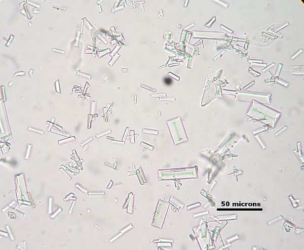 - Оксалаты — бесцветные, сильно преломляющие свет кристаллы оксалата кальция в форме почтовых конвертов — октаэдров.