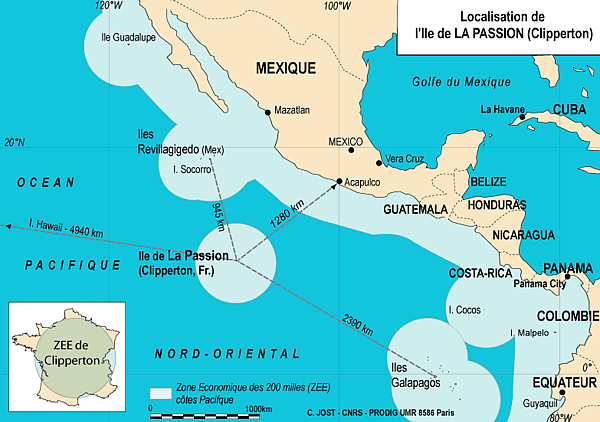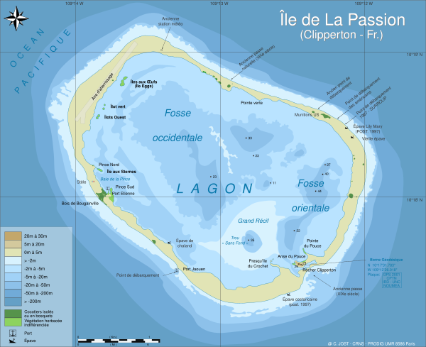 В дневнике Прюдома также говорится о низменном песчаном острове, на котором не было каких-либо следов человека, «как будто всё здесь было смыто течением»[8]. Нет никаких сомнений, что открытый французами остров Страсти и был остров Клиппертон, так как указанные ими координаты атолла лишь незначительно отличаются от современных.
