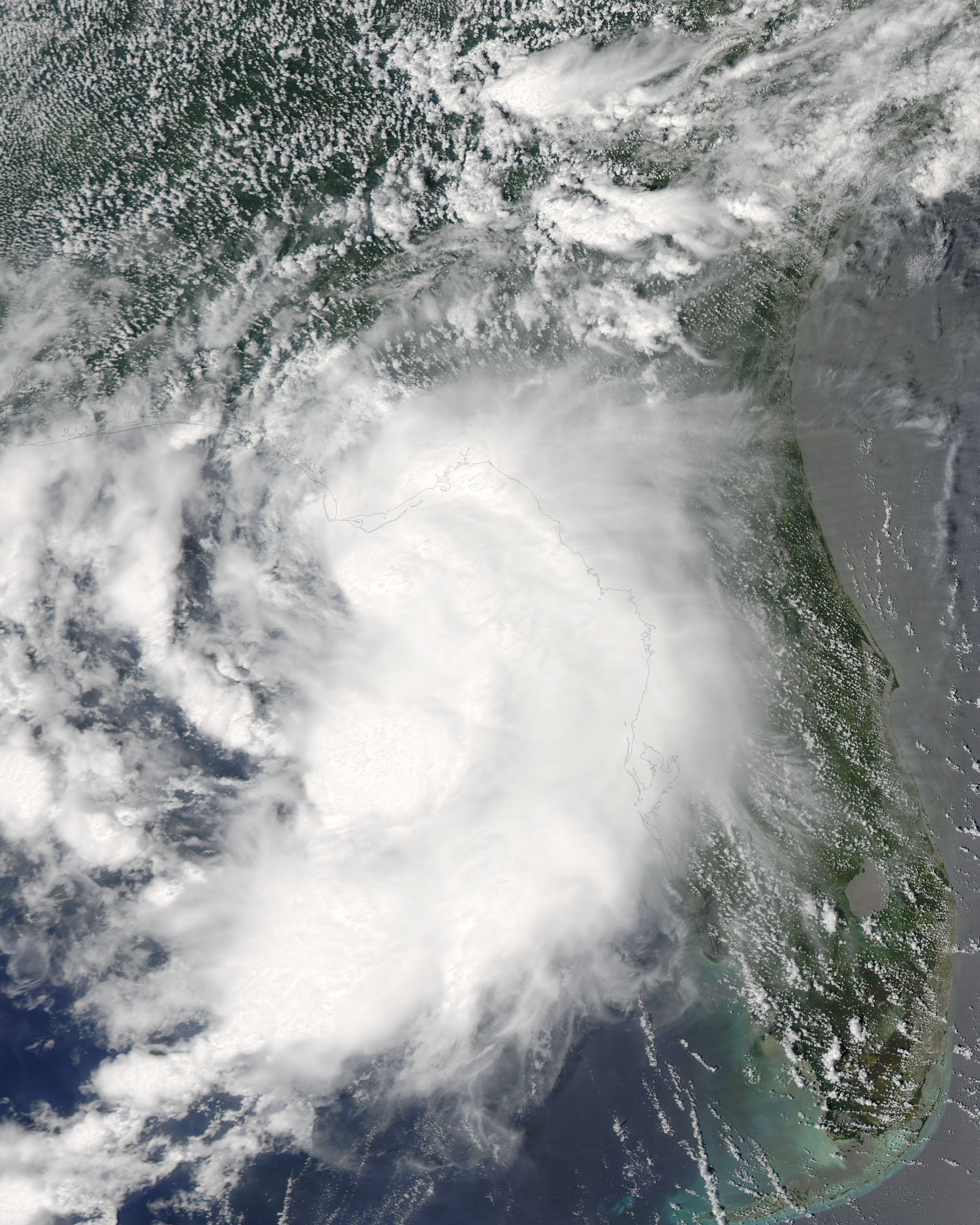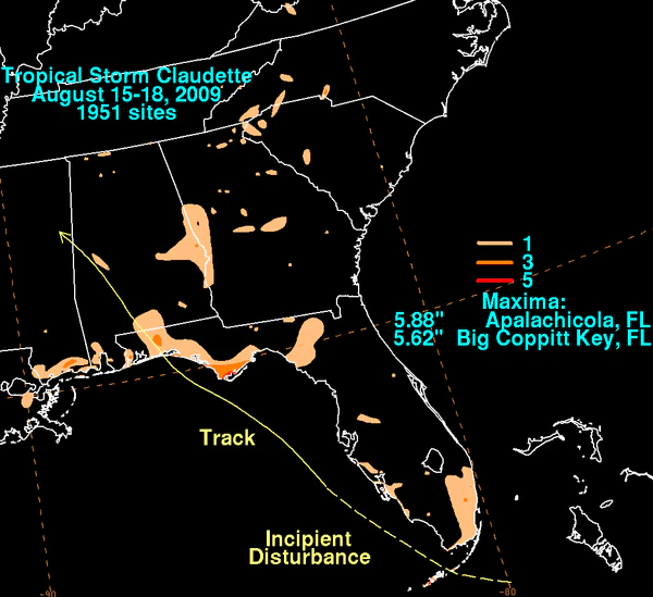 К вечеру 16 августа в некоторых районах округа Франклин в штате Флорида выпало до 43 мм осадков[30]. Ливневый дождь прошёл также в Апалачиколе — за день в городе выпало 90 мм осадков, побив тем самым предыдущий рекорд 1931 года[31]. За исключением упавших на автомагистраль US 98 в некоторых местах деревьев[32], в округе Франклин шторм не нанёс практически никакого ущерба. Максимальный объём выпавших осадков в 143 миллиметра был зарегистрирован в районе Биг-Коппитт-Кей[33].