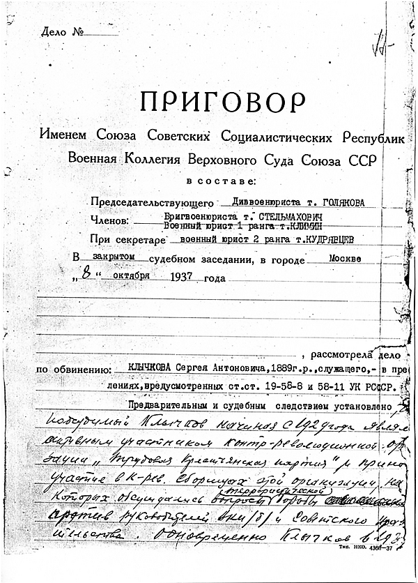 8 октября 1937 года приговорён к смертной казни на закрытом заседании Военной коллегии ВС СССР (началось в 21 час 30 минут, закончилось в 21 час 55 минут, свидетели по делу не вызывались)[1]. Ему было предъявлено сфабрикованное обвинение в участии в вымышленной «контрреволюционной» организации «Трудовая крестьянская партия»[7]. Сергей Клычков виновным себя не признал. В тот же вечер он был расстрелян. Прах был зарыт в общей безымянной могиле на Новом Донском кладбище. Конфискованный архив поэта уничтожен по акту 2 сентября 1939 года[1]. В 1956 году Сергей Клычков был посмертно реабилитирован «за отсутствием состава преступления». В справке о реабилитации указана ложная дата смерти — 21 января 1940 года, перешедшая в некоторые издания.