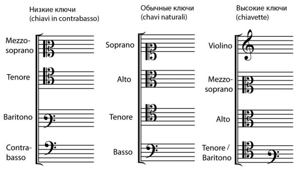 В вокальной многоголосной музыке второй половины XVI и в XVII веках (редкие примеры встречаются и в музыке XVIII века) композиторы использовали стандартные комбинации ключей, для удобства нотации регистровых диапазонов голосов (амбитусов) без использования добавочных линеек. Наиболее распространёнными были 2 комбинации: обычные ключи (итал. chiavi naturali) и высокие ключи (итал. chiavette букв. «ключики»); гораздо реже встречались низкие ключи (итал. chiavi in contrabasso):