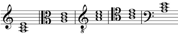 Добавление к ключу сверху или снизу индексов 8 (октавное перемещение) или 15 (двухоктавное перемещение) указывает, что нотированную музыку следует исполнять на октаву/две октавы вверх/вниз: