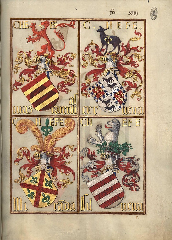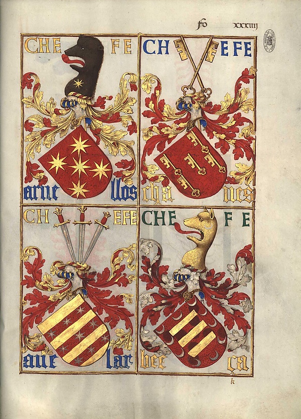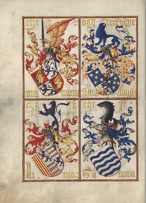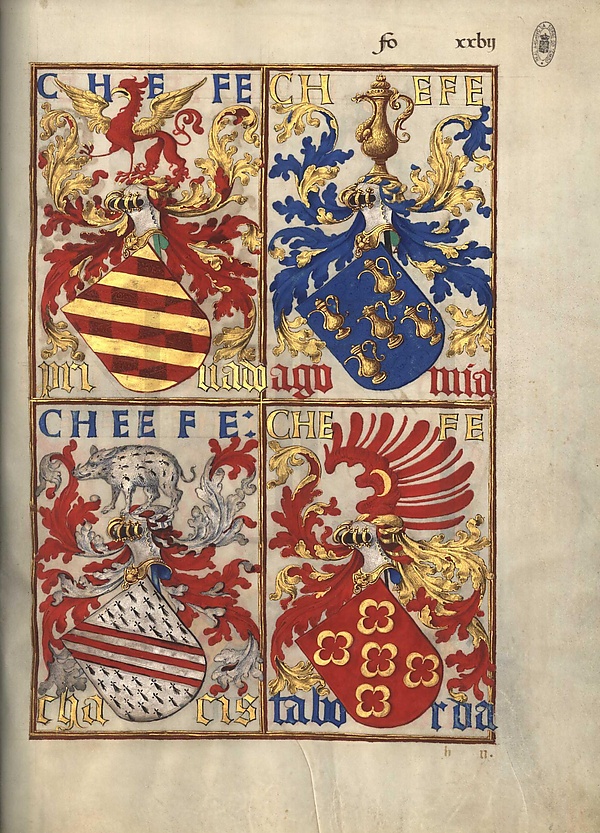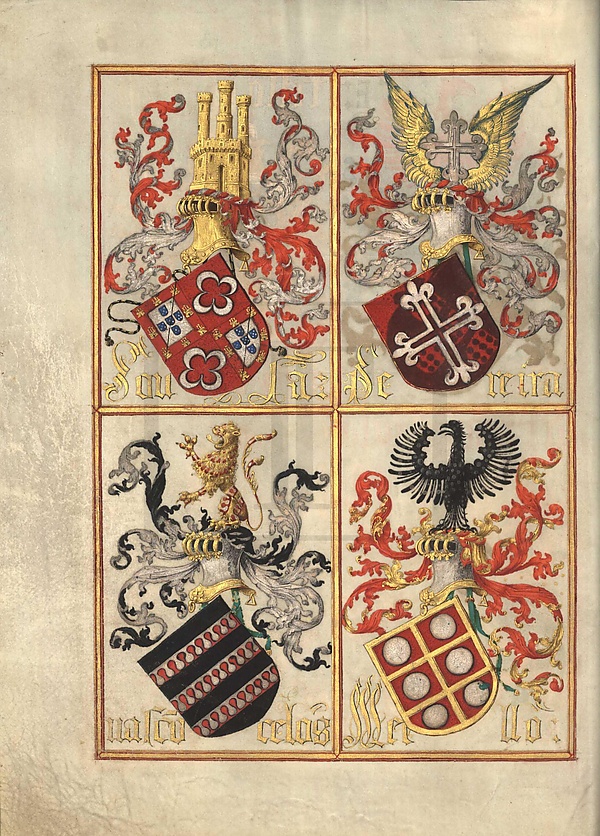 - f. XIV r — Машкареньяш (Mascarenhas), Сервейра (Cerveira), Миранда (Miranda), Силвейра (Silveira)