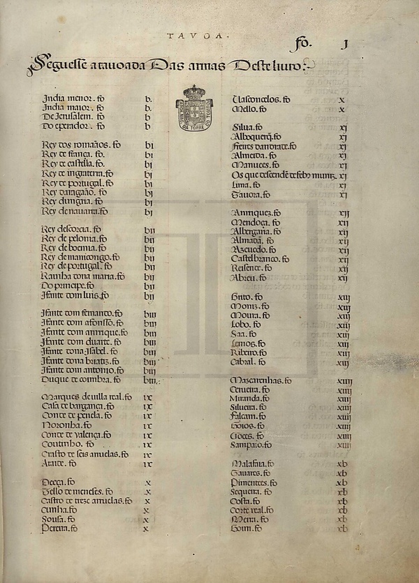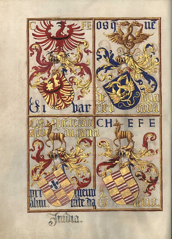 - f. XVIII v — Агилар (Aguilar), потомки Дуарте Брандана (Os que descendem de Duarte Brandão), потомки Васко да Гамы (Os que descendem do conde D. Vasco da Gama, Гама (Gama)