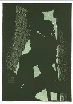 В технике офорта с раскраской акварелью. Техника различная — раскрашенные акварелью штриховые рисунки (пером, предназначенные для последующей раскраски) или чёрно-белый силуэт. Штрих и силуэт иногда дополняют друг друга.