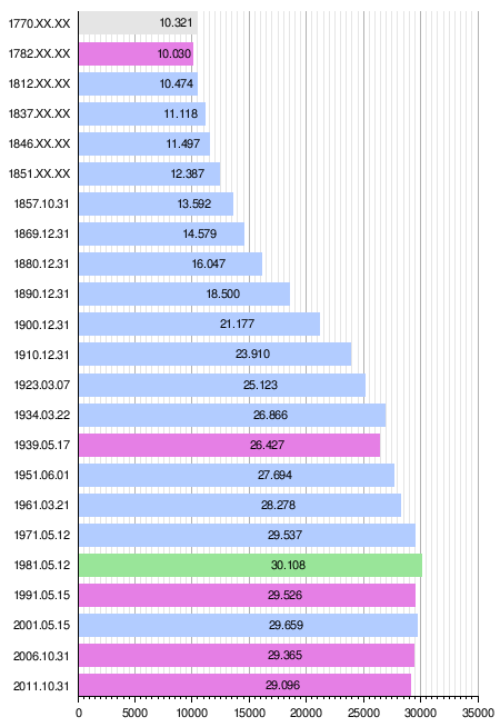 Изменение численности населения на территории судебного округа в 1782-2011 гг. по данным налоговых, поместных, военных, церковно-приходских, судебных (1782—1863 гг.) и общенациональных (в том числе пробных и регистрационных) переписей за 1869—2011 гг.[13][14]