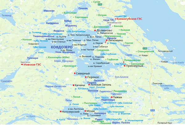 На схеме обозначены синим цветом озёра, вошедшие в состав водохранилища, голубым — реки и протоки, зелёным — горы, красным — поселения, бывшие лесоучастки. Цифрами обозначены: 1)Княжегубский гидроузел, 2)Ляхкоминский гидроузел, 3)Тупьегубский гидроузел.