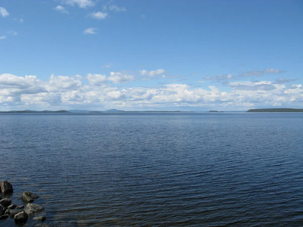 Береговая линия имеет большое количество заливов. На дне водоёма наблюдаются перепады глубин. Нередко встречаются заболоченные участки. Берега в основном низкие, поросшие лесом. Среди растительности преобладают тростник и камыши, причём только в мелководных и защищённых от ветра местах. Слабое развитие флоры связано с влиянием прибоя на побережье и колебаниями уровней. Есть и места со значительной высотой — до 150 метров. На таких скалистых берегах покрытие состоит из валунов и гальки.