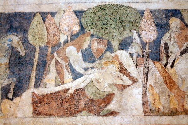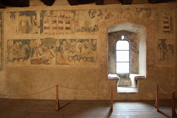 Около 1346 года была выполнена настенная полихромия[5] в большой зале на третьем этаже. Картины были выполнены с помощью техники альсекко — краску наносили на высушенную штукатурку[4]. Их сюжет уникален, так как связан с легендами о рыцаре Ланселоте. В августе 2006 года началась комплексная реставрация фресок.