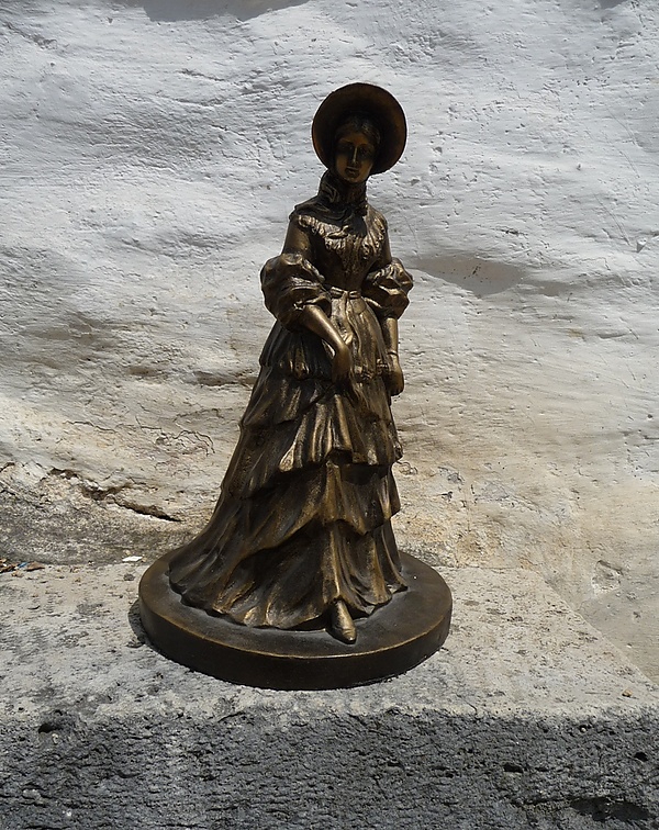 При создании скульптуры использованы гипс и технология бронзирования. Сначала выполнена гипсовая модель, позволяющая отработать все детали. Затем произведено бронзирование с целью получения долговечного изделия. Техника бронзирования позволяет точно воспроизвести текстуру платья и выражение лица.