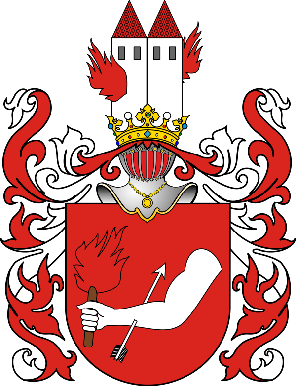 В красном поле обращённая влево рука, держащая факел и пронзённая наискось вправо стрелою (изм. герб Полота). Щит увенчан дворянскими шлемом и короной. Нашлемник: две башни с флагами. Намёт на щите красный, подложенный серебром.