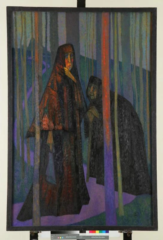 На полотне представлен молодой мужчина в красной одежде и жёлтом плаще, изображённый в полный рост. Его голова наклонена влево, а руки скрещены на груди, что придаёт образу задумчивость и собранность. Фон картины выполнен схематично, включает деревянные конструкции и плоскость, выдержанную в охристо-зелёно-коричневой цветовой гамме. Работа относится к жанру портрета.