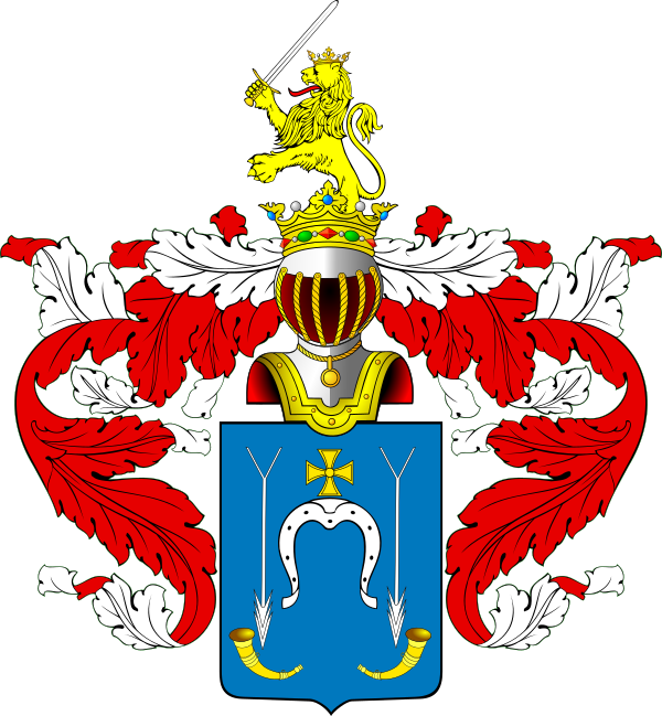 Описание герба: Выписка из Общего гербовника В щите, имеющем голубое поле, изображён золотой Крест, поставленный на серебряной Подкове, шипами обращённый вниз, по сторонам которой видны две серебряные же Стрелы, летящие к означенным в нижней части у боков щита охотничьим золотым Рогам. Щит увенчан дворянскими шлемом и короной. Нашлемник: до половины выходящий Лев в золотой Короне с Мечом. Намёт на щите красный, подложенный серебром. |