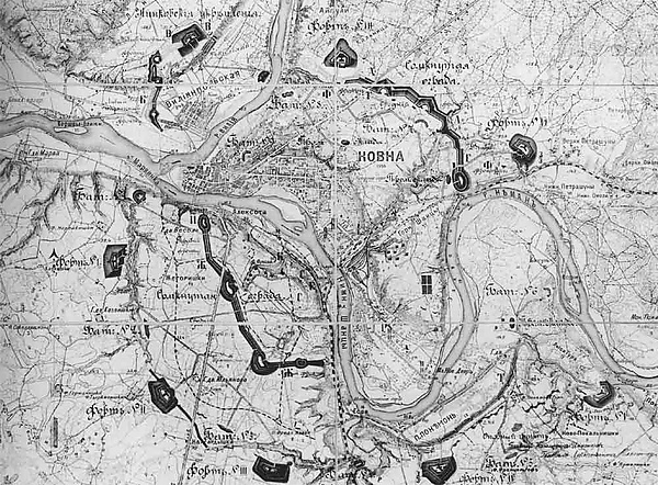 Первый генеральный план Ковенской крепости, подготовленный генерал-адъютантом Н. Обручевым совместно с инженер-генералами К. Зверевым и И. Вальбергом, предусматривал строительство семи фортов и девяти батарей, укреплений сомкнутой ограды, казематированных складов, казарм, административных зданий а также прокладку дорог на все укрепления. Строительные работы, поручены Н. М. Шевцову (постройка эта обошлась на несколько миллионов дешевле первоначальной сметы и в то же время была последним словом военно-инженерного дела)[6] начались в 1882 году и продолжались до 1889 года. Под нужды крепости были приобретены большие участки в районах Фреда, Алексотас, Панемуне, в новом центре города. Постепенно происходило переустройство города под нужды крепости, руководство крепости стало поднимать вопрос о выделении крепостного района в самостоятельную административную единицу под военным управлением.