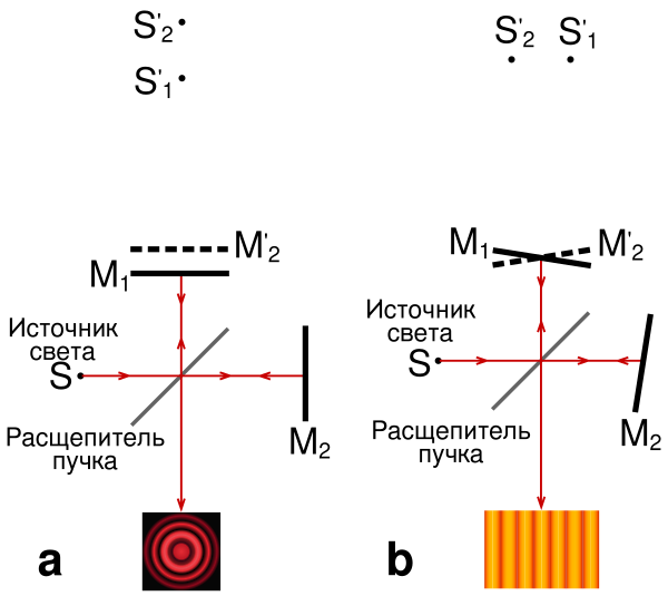 Проиллюстрируем понятие временной когерентности на примере эксперимента с интерферометром Майкельсона.[2] Предположим, что источник S испускает квазимонохроматический свет, то есть ширина полосы частот мала по сравнению со средней частотой. Предположим, что путь при отражении от зеркала на расстояние 2d длиннее, чем при отражении от зеркала . Тогда разность хода .
