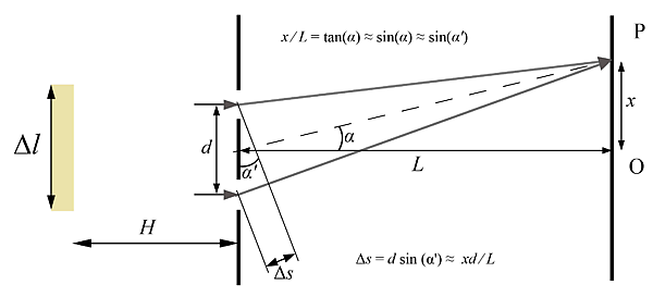 При этом разность путей при прохождении света от точки источника до каждой из щелей вычисляется так же, как и в опыте Юнга: , где y — координата точки на источнике.