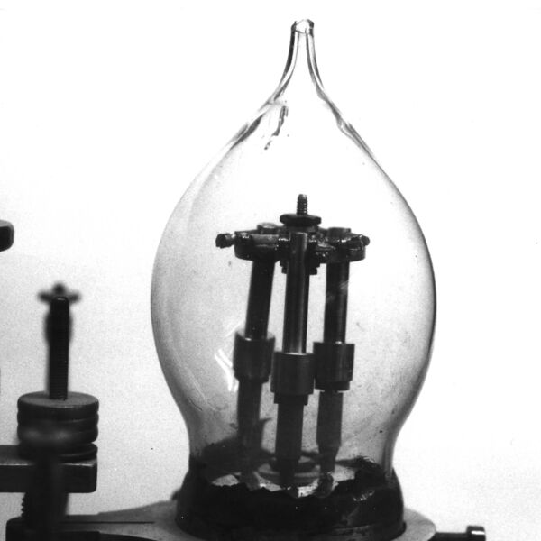 В 1894 году «трубка Бранли» была использована Лоджем, который дал ей название «когерер»[* 3], имея в виду сцепление опилок между собой под действием электромагнитных волн[1]:147. Результаты работ были доложены Лоджем в июне (лекция «Работы Герца»[7]:50) и августе 1894 года и тогда же опубликованы. Доклады сопровождались демонстрацией приёма электромагнитных волн от передатчика, находившегося вне здания. Индикацию сигналов обеспечивал гальванометр[9][3]. Для встряхивания опилок Лодж использовал включённый последовательно с когерером электрический звонок, вибрация которого после срабатывания передавалась когереру через элементы конструкции. Позднее Лодж использовал постоянно работающий ударник с часовым механизмом, не создающим (как звонок) электрических помех[8][7]:54.