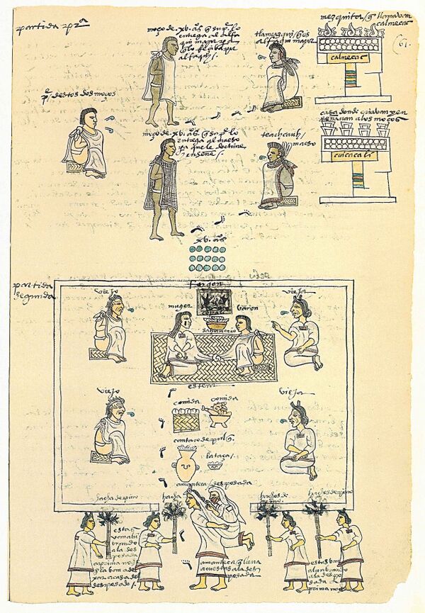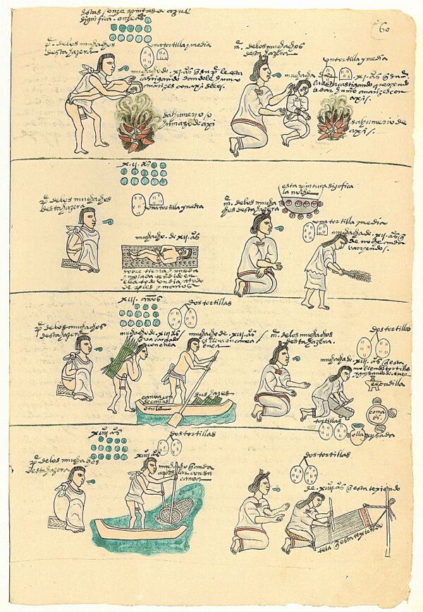 Мешики, появляющиеся на страницах «Кодекса Мендоса», это не только решительные завоеватели и воители, но также непослушные дети, заядлые игроки в мяч, жизнерадостные музыканты, благочестивые жрецы, презренные прелюбодеи… мы наблюдаем их развитие от колыбели до могилы, следуя путями, избранными «хорошими» и «плохими» мешиками, как они проходили по жизни предписанные ступени. Дети воспитывались, браки заключались, жрецы-новички обучались, войны объявлялись и приговоры выносились. Очевидно, жизнь мешиков имела многие измерения, и «Кодекс Мендоса» касается большинства из них.