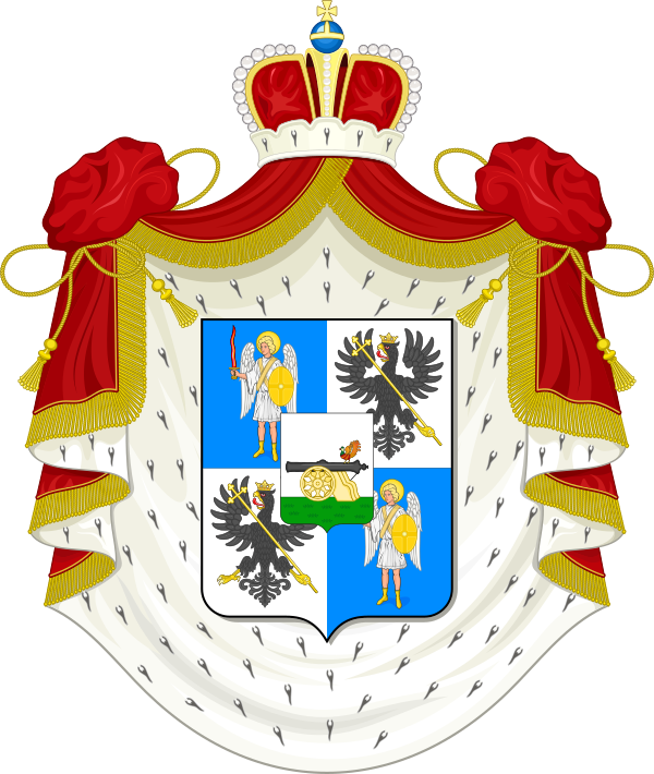 Описание герба: Выдержка из Общего гербовника Гербовый щит разделен двумя перпендикулярами на четыре поля, а на пересечении перпендикуляров помещен пятый малый щиток, заключающий герб смоленского княжества, — для показания происхождения рода от владетельных смоленских князей. Остальные поля щита заключают накрест расположенные, в шахматном порядке, гербы княжеств Киевского и Черниговского. Киевский герб занимает первое и четвертое деление щита, а черниговский герб — второе и третье. Гербовый щит положен на княжеской мантии и увенчан по обычаю княжескою шапкою. |