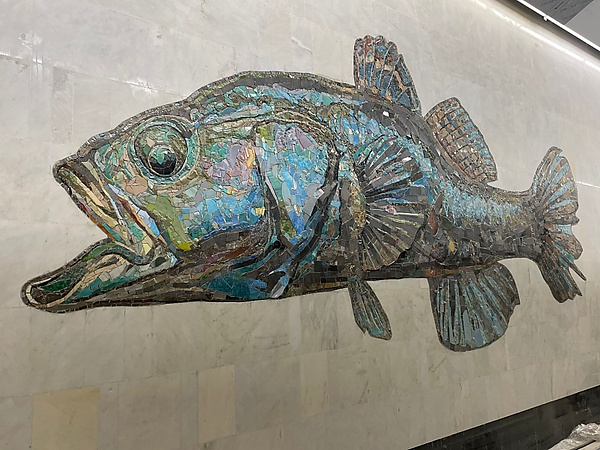 На станции Большой кольцевой линии Московского метрополитена «Нагатинский Затон» — двенадцать мозаичных панно с изображением рыб разных форм и размеров.[4]