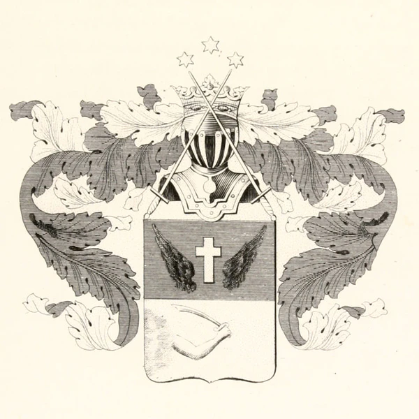 Щит разделён горизонтально на два поля: верхнее голубое и нижнее золотое. Сверху изображено два чёрных орлиных крыла и между ними золотой крест, а снизу выходящая из облака обнажённая рука с мечом. Щит увенчан дворянским шлемом и короной. Сквозь корону крестообразно положены две шпаги остриями вверх и над оными находятся три золотых шестиугольных звезды. Намёт на щите голубой, подложен золотом.