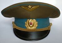 Общевойсковая повседневная кокарда в ВС СССР была овальной формы с красной звездой в белом медальоне, окруженном золотистыми лучами. Для офицеров авиации и ВДВ была предусмотрена также кокарда, но с эмблемой (обрамление золотистыми веточками). Для парадно-выходной и повседневной фуражек офицеров, прапорщиков, военнослужащих сверхсрочной службы авиации и ВДВ, курсантов авиационных училищ лётчиков (штурманов) Советской Армии предусматривалась ещё эмблема на тулье[5] — некоторыми называемая птичка, верхняя кокарда или технический знак. На парадной фуражке всех офицеров носилась кокарда с ещё более развитым обрамлением (для ВДВ и ВВС — с крылатой эмблемой), а фуражки генералов и маршалов украшали различного вида шитье из золочёных нитей вокруг кокарды.
