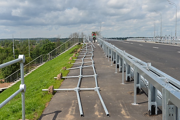 Велосипедной дорожки нет ни на путепроводе, ни на подходе к нему, идущему от центра поселения Кокошкино — она начинается в чистом поле, в нежилой зоне. Фактическая ширина, вместо заявленных 2,2 м, составляет 1,1 — 1,7 м. Обочина пешеходной дороги идёт крутой склон, не содержащий защитных ограждений.