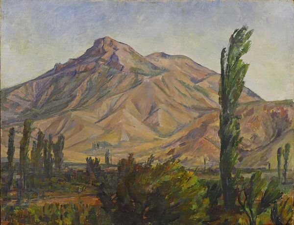 На первом плане картины представлен пейзаж с проходящей дорогой, слева изображена группа деревьев, в центре выделяется раскидистое дерево, а справа — высокое дерево. На втором плане возвышается гора, по террасам которой также проходит дорога. Небо на картине чистое. В левом нижнем углу размещена надпись: «черкес 34».