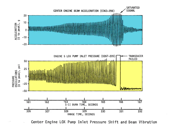 Колебания представляли большую проблему во время «лунной гонки», когда возросла мощность двигателей и стали строить тяжелые ракеты.[6] В частности, необходимость мер противодействия задержала работы по «Сатурн-5» более чем на полгода. Проблемным был и второй пуск, который предшествовал пилотируемым полётам, «Аполлон-6». Наблюдались отказы двигателей и повреждения силовых элементов на первой ступени, из-за чего цели миссии были достигнуты лишь отчасти[6]. Однако явление не было излечено до конца и опасно проявило себя ещё раз при выведении «Аполлона-13», когда из-за бросков давления аварийно отключался один из двигателей второй ступени.[1][2] Советская лунная ракета «Н-1», в том числе и по этой причине,[10] провалила испытания и вообще не была доведена до работоспособного состояния.[1]