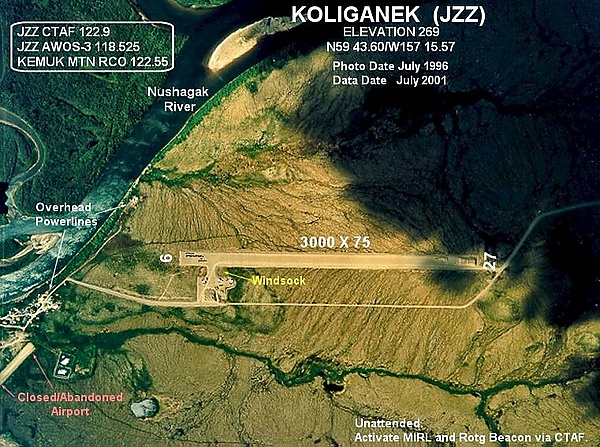 - Airport diagram of Koliganek (JZZ) (GIF). FAA, Alaska Region. 19 Feb 2004.