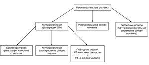 Существует 2 основных метода, используемых при создании рекомендательных систем — коллаборативная фильтрация и контентно-основанные рекомендации. Также на практике используется гибридный метод построения рекомендаций, который включает в себя смесь вышеперечисленных методов. Коллаборативная фильтрация, в свою очередь, также разделяется на 3 основных подхода (типа) [4]: