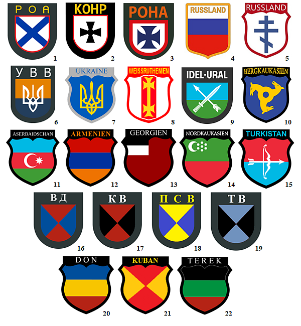 - представители тюркских народностей (в том числе грузины, армяне, таджики, народы Северного Кавказа) и казаки; рассматривались в качестве равноправных союзников, сражавшихся плечом к плечу с солдатами Германии против большевизма в составе специализированных частей (туркестанские батальоны, казачьи части и др.)[84];