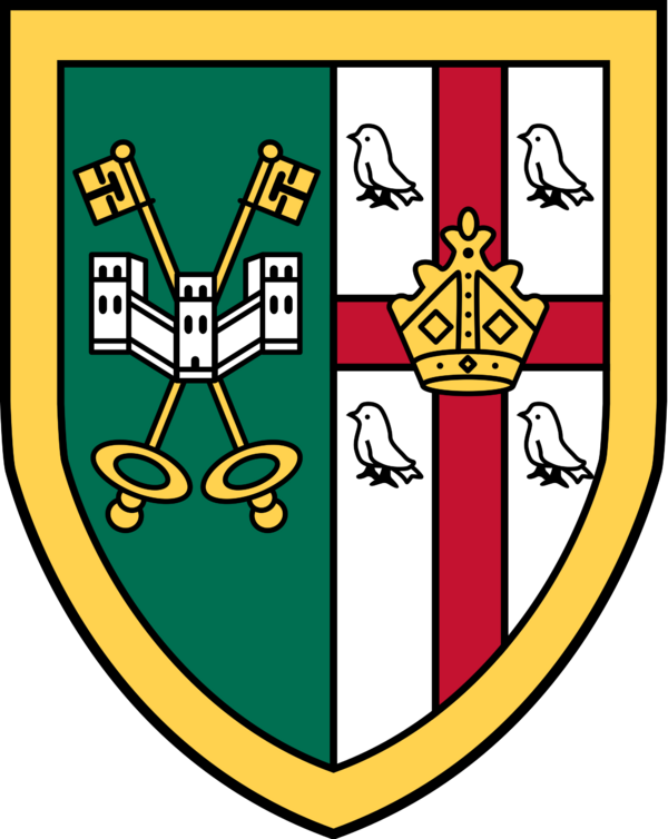 Описание герба: Per pale vert and argent, to the dexter two keys in saltire or surmounted by a triple towered castle argent masoned sable and on the sinister a cross gules surmounted by a mitre or between four martlets sable, the whole within a bordure or.