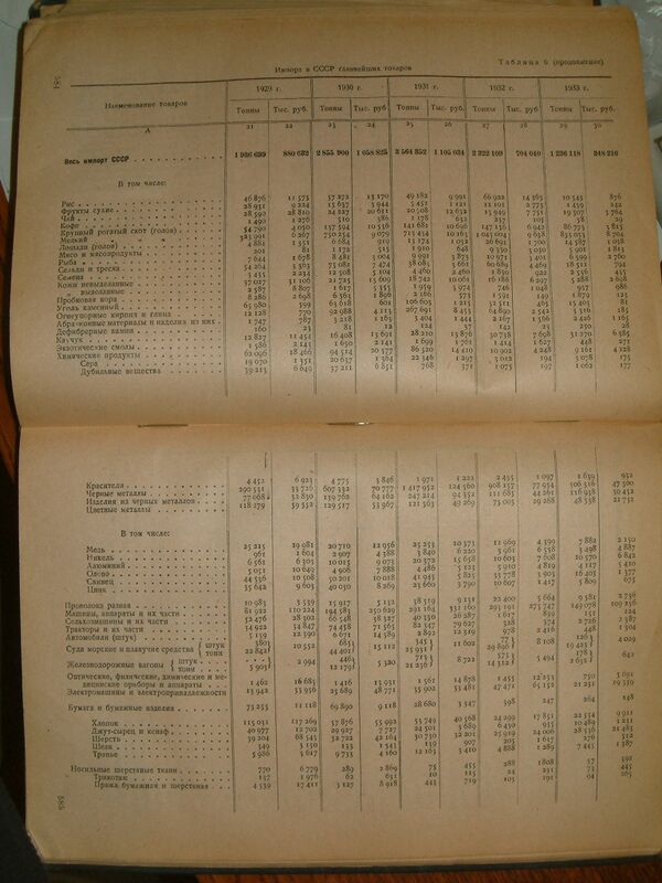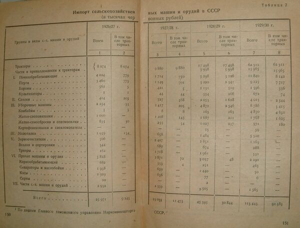 - Импорт сельскохозяйственных машин и тракторов (тысяч червонных рублей): 1926/27 — 25 971, 1927/28 — 24 033, 1928/29 — 45 595, 1929/30 — 113 443, 1931 — 97 534, 1932—420.