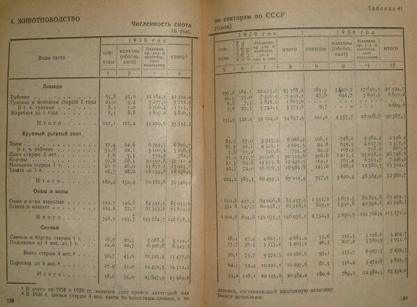 - массовый убой крестьянами скота из-за нежелания отдавать его на колхозные фермы, массовая гибель лошадей из-за нехватки фуража, массовая гибель скота из-за эпизоотий, холода и бескормицы на колхозных фермах катастрофически снизили поголовье скота по всей стране;