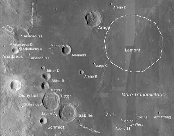 - 24 июля 1969 г. в 16:50:35 UTC, приблизительно в 20 км на юге-юго-западе от кратера, в точке с координатами G, совершил посадку лунный модуль Аполлона-11.