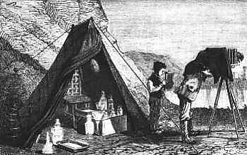 В результате в коллодии образовывались микрокристаллы йодистого серебра, придающего ему светочувствительность. Сразу после этого фотопластинка экспонировалась и проявлялась водно-спиртовым раствором пирогаллола, а затем закреплялась в растворе гипосульфита[3]. Впоследствии в качестве светочувствительного вещества оказались пригодными также соли брома, дающие при взаимодействии с азотнокислым серебром бромосеребряные кристаллы. Коллодионный процесс оказался настолько технологичным, что в течение всего нескольких лет вытеснил дагеротипию и полностью заменил негативную стадию калотипии. Единственным недостатком оказались неудобства внестудийной съёмки, поскольку коллодий становился непроницаемым для проявителя всего за 10—15 минут из-за быстрого испарения эфира и кристаллизации растворимых солей[11][1]. Однако, даже это было преодолимо при помощи передвижных фотолабораторий-палаток, в которых фотопластинки готовились и проявлялись сразу после съёмки. С помощью коллодионного процесса были получены первые военные фоторепортажи, снимавшиеся Роджером Фентоном во время Крымской войны[12]. Благодаря большой разрешающей способности и дешевизне мокрый коллодионный процесс использовался в некоторых областях технической фотографии (например, для изготовления шкал и в полиграфии) вплоть до 2000-х годов[13][14].