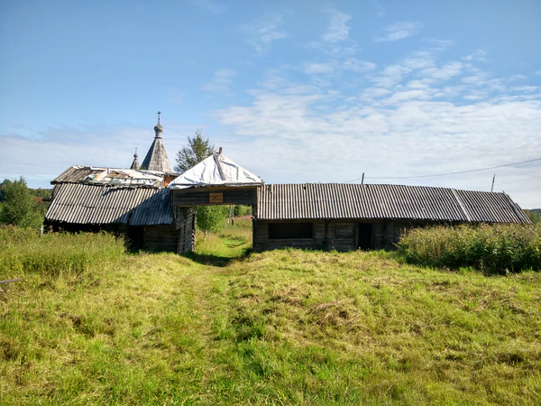 Ограда погоста отделяла его от деревни и была возведена поперёк узкой части полуострова. Торговые лавки, устроенные в ограде, вместе с парой амбаров формировали торговую площадь деревни. Входная конструкция ограды, состоящая из арки входа и срубов торговых лавок по бокам от неё, — это единственное, что сохранилось от ансамбля к концу XX века[5].