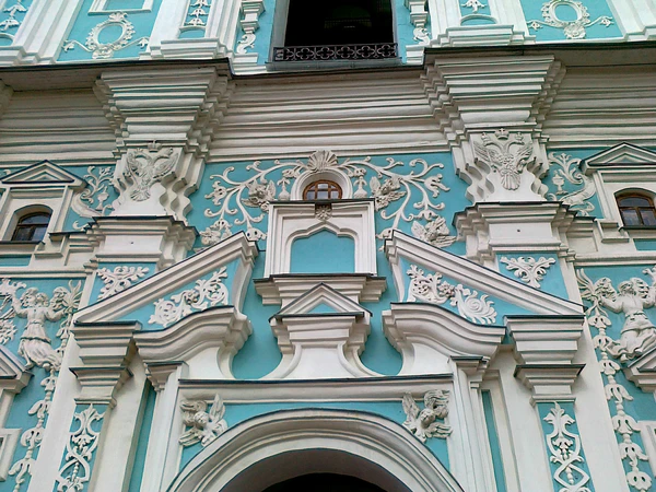 Колокольня украшена разнообразным лепным орнаментом, в который вплетены сюжетные барельефы — динамические фигуры ангелов в виде украинских парней в подпоясанных кафтанах, изображения купидонов, цветов в корзинах, масок, букетов, гирлянд, балдахинов над нишами, геральдических двуглавых орлов и тому подобное[7][1][6][11].