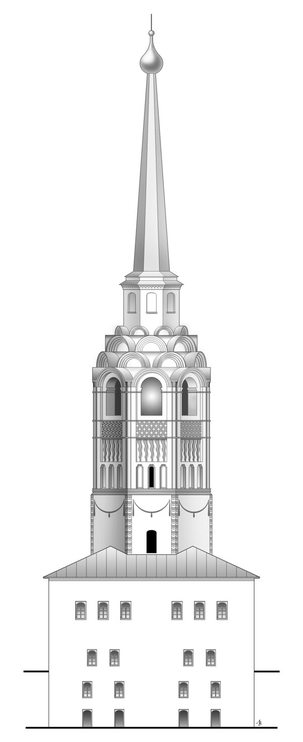 Ребра башни имеют полуколонки с небольшими капителями, подчеркивающие вертикальную устремлённость башни. Ствол башни под арками расчленен на два яруса, верхний из которых богато декорирован фигурной кладкой. Элементы кладки ярко раскрашены в несколько цветов, что ещё более подчеркивает декоративную выразительность.