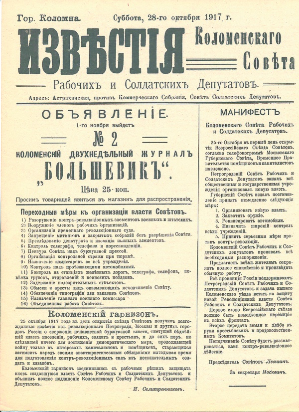Первый номер был опубликован под названием «Известия Коломенского Совета рабочих и солдатских депутатов» 10 ноября (по старому стилю — 28 октября) 1917 года[1][2]. Газета выходила дважды в неделю — в понедельник и субботу[1].