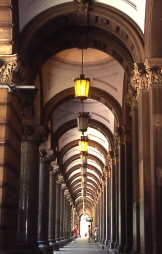 При использовании колоннад внутри зданий ими обычно обрамляют крупные залы и используют для расчленения и одновременно связи отдельных частей парадного интерьера.