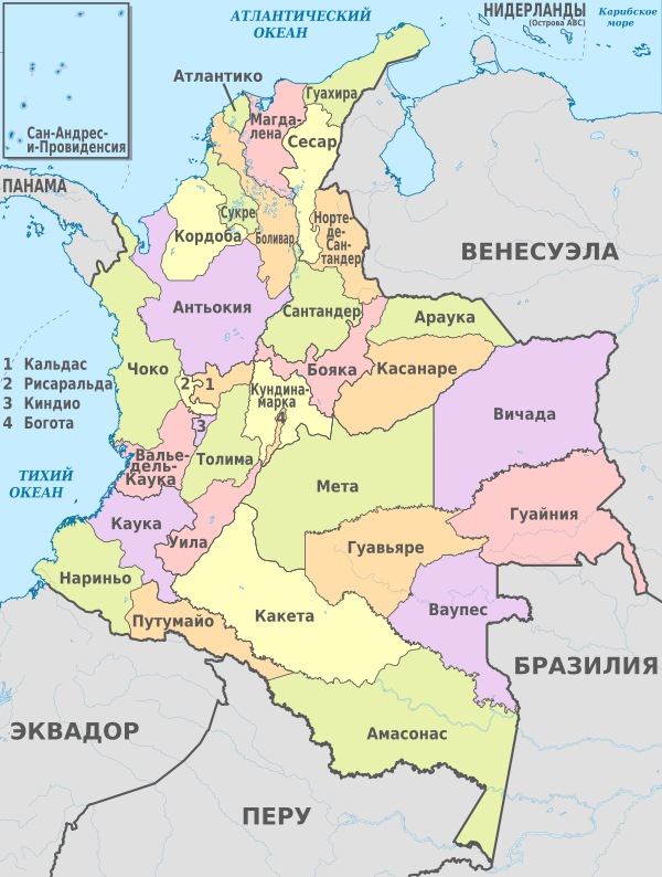 Административное деление Колумбии было установлено Конституцией 1991 года[65], поправками к ней и законом 136 от 2 июня 1994 года[66]. Выделяются три уровня административно-территориального деления. На первом уровне административного деления находятся департаменты и столичный округ Богота, на втором — муниципалитеты.