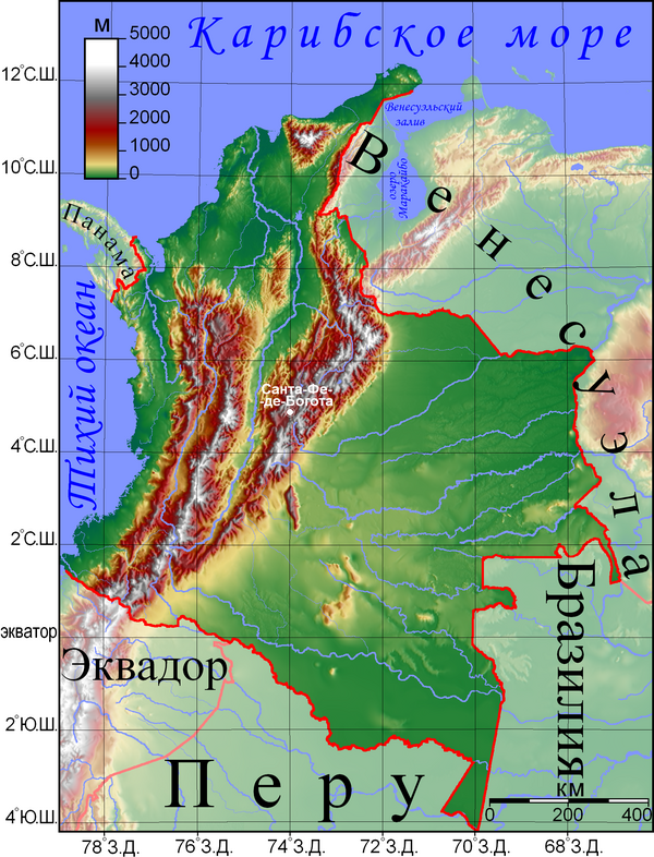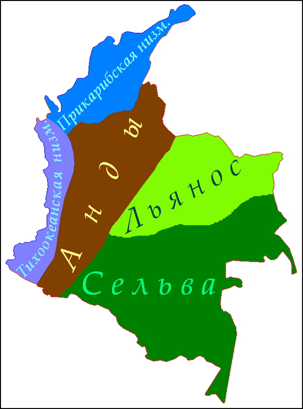 Колумбия омывается на западе Тихим океаном, на северо-западе Карибским морем. На западе страны с севера на юг протянулись Анды, расчленённые реками Магдалена, Каука и другими более мелкими. На востоке расположено плоскогорье, пересекаемое притоками Амазонки. Вдоль побережий раскинулись низменности.
