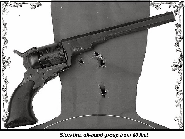 Достаточно длинный нарезной ствол обеспечивал неплохую точность стрельбы. Пробные стрельбы на дистанции 18 м из точной реплики «Патерсона» производства итальянской фирмы «Уберти» позволили уложить группу выстрелов в пределах 5,1—7,6 см (оружие удерживалось одной рукой)[7].