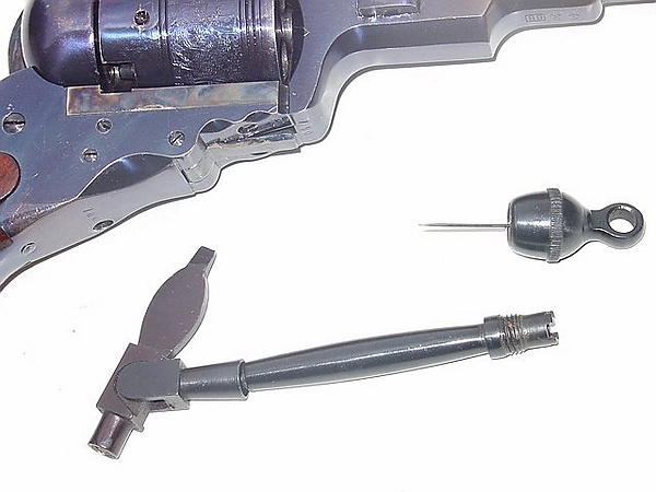 - Поставив курок на полувзвод и, используя разработанный Кольтом инструмент, установить капсюли на брандтрубки.