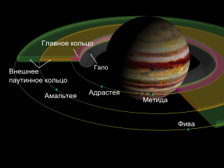 Кольца Юпитера — третья открытая в Солнечной системе система колец, после колец Сатурна и Урана. Впервые кольца Юпитера наблюдались в 1979 году КА Вояджер-1.[5] В кольцевой системе 4 основных компонента: толстый внутренний тор из частиц, известный как «кольцо-гало»; относительно яркое и тонкое «Главное кольцо»; и два широких и слабых внешних кольца, известных как «паутинные кольца», называющиеся по материалу спутников, которые их и формируют: Амальтеи и Фивы.[11] Основные характеристики Юпитерианских колец приведены в таблице ниже.[6][9][11][13]