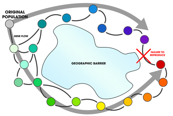 Согласно определению, данному одним из основоположников биологической концепции вида американским биологом Эрнстом Майром, биологический вид представляет собой «группу фактически или потенциально скрещивающихся естественных популяций, которая физиологически изолирована от других подобных групп».[3] В целом данное определение справедливо для подавляющего большинства организмов, однако в природе встречаются животные, которые в процессе расселения создавали всё новые и новые формы (или подвиды), которые в зонах интерградации (местах контакта) свободно скрещивались между собой. Расселение происходило в различных направлениях, и в конце концов разные подвиды вновь встречались между собой, однако зону интерградации уже не образовывали, а вели себя как самостоятельные виды. Ниже даны примеры кольцевых видов.