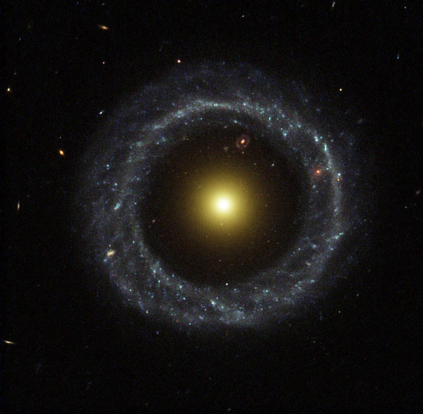 Столкновительные кольца возникают в результате столкновений галактик, при которых небольшая галактика сталкивается с более крупной, двигаясь в направлении оси более крупной галактики. Такое столкновение вызывает волну плотности, которая расходится от центра и образует кольцо[20].