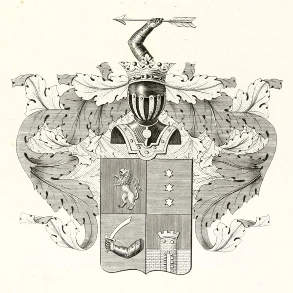 Щит разделен на четыре части, из них в первой части, в красном поле, находится золотой лев. Во второй части, в голубом поле, три серебряные шестиугольные звезды (изм. польский герб Гвязды). В третьей части, в голубом же поле, рука в серебряных латах с мечом. В четвёртой части, в красном поле, золотая крепость.